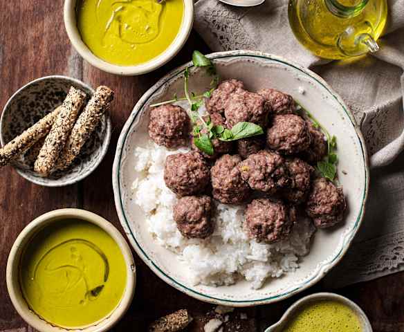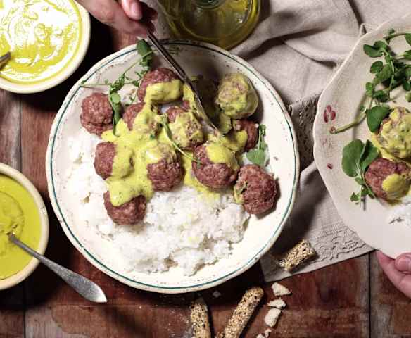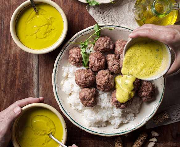 Crema de verduras, albóndigas en salsa de mostaza con arroz