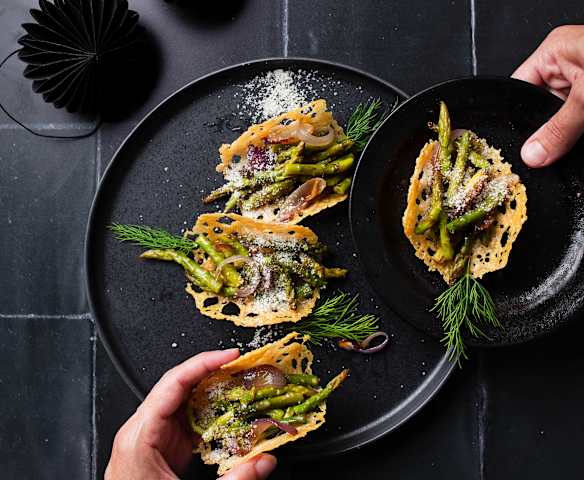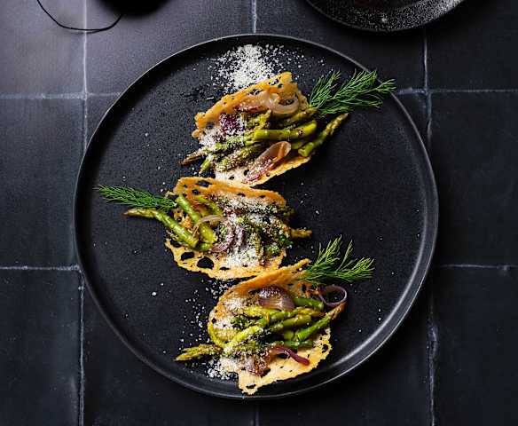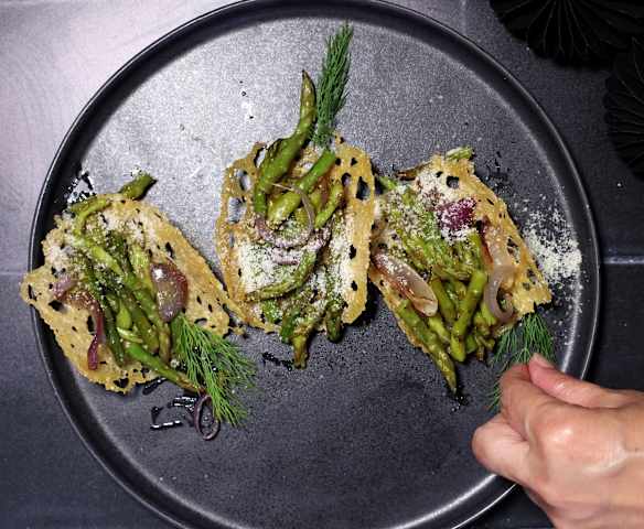 • de espárragos verdes frescos finos (sin la parte leñosa), en trozos de 3-4 cm