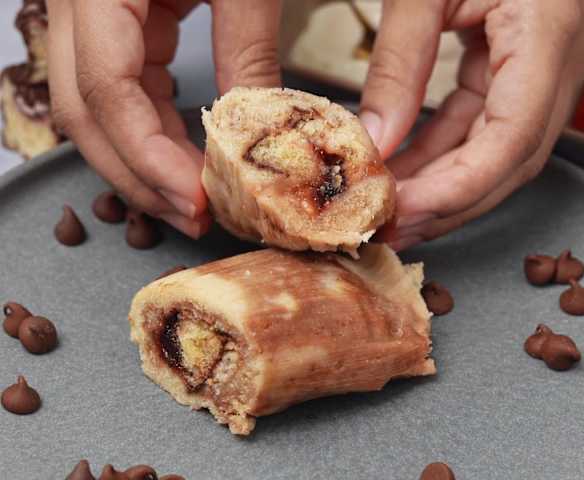 300 g de pastelito de vainilla relleno de crema y mermelada, cubierto con chocolate tipo gansito, rebanados por la mitad.