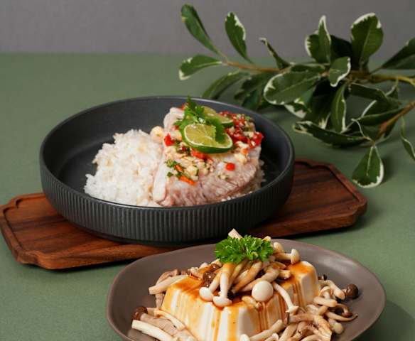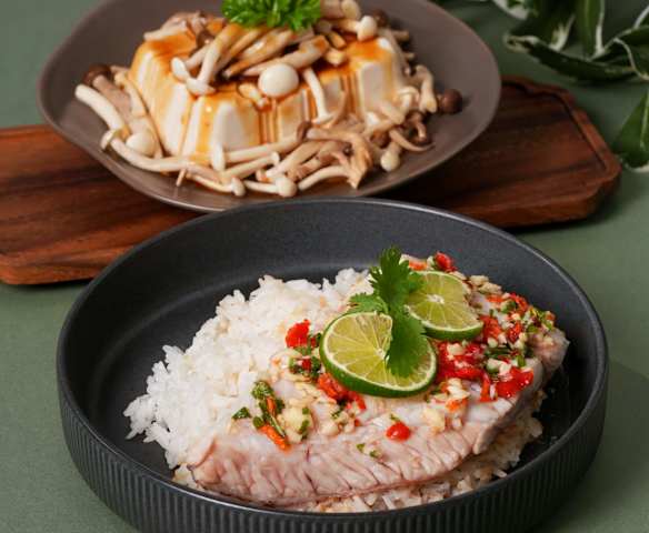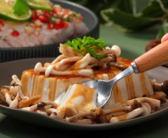 Three-in-One Steamed Thai Style Fish and Tofu with Shimeiji Mushrooms