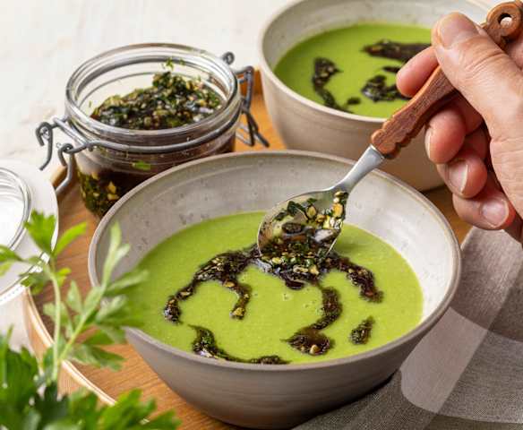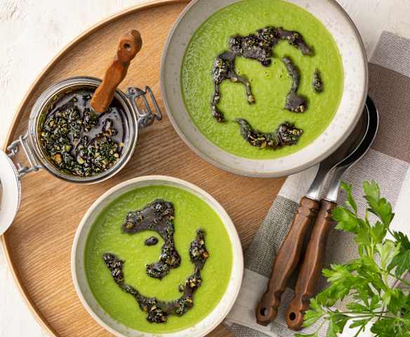 Süßkartoffel-Kürbis-Suppe mit Kräutercroûtons