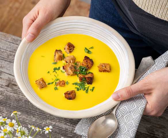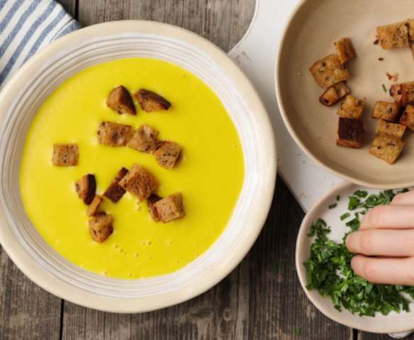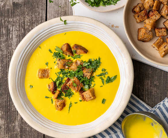 Süßkartoffel-Kürbis-Suppe mit Kräutercroûtons