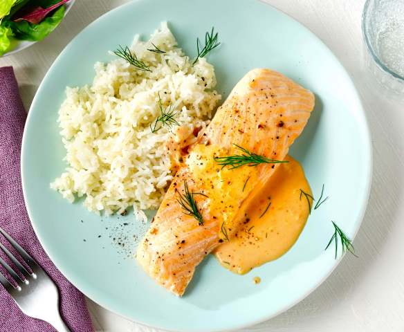 Lachs und Basmati-Reis mit Dillsauce