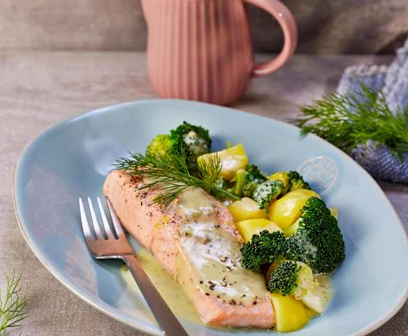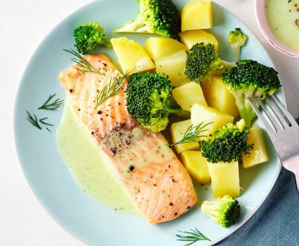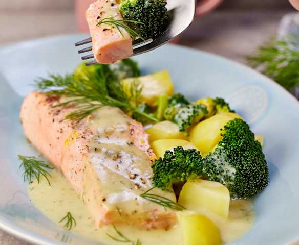 Lachsfilet mit Brokkoli, Kartoffeln und Dillsauce