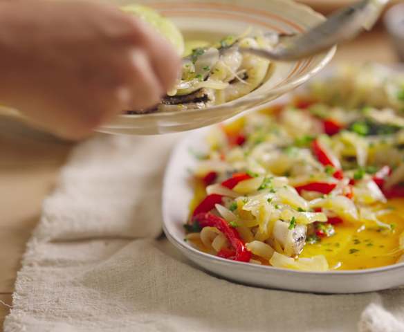 Escabeche de peixe-espada com batatinha nova e molho de mostarda