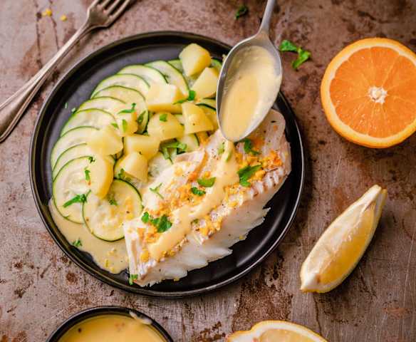 Steinbuttfilet auf lauwarmem Rote-Bete-Apfel-Salat mit Kartoffelgröstel