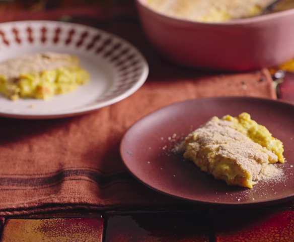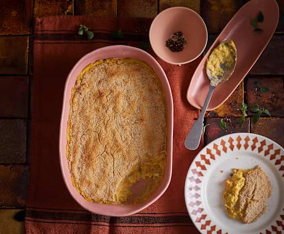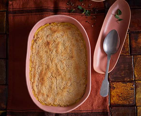 Bacalhau com feijão e grelos com crosta de broa e batatas no forno