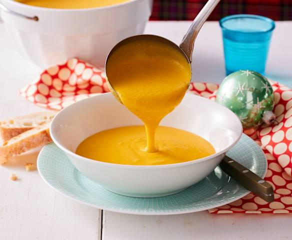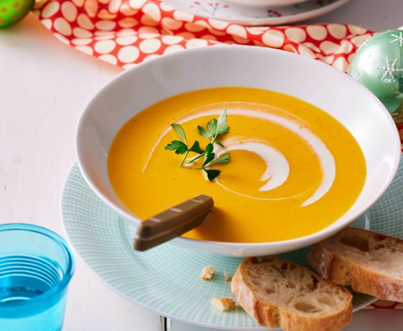 Süßkartoffel-Kürbis-Suppe mit Kräutercroûtons
