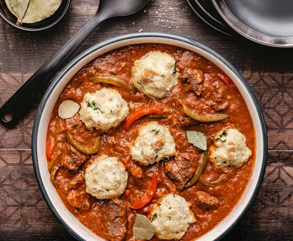 Hovězí guláš a knedlíky v páře