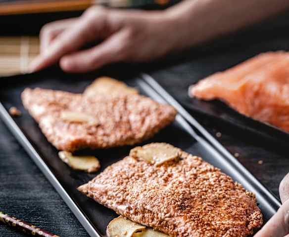 Op Cederhout gegrilde Zalm met Pesto en Paddenstoelen-orzotto