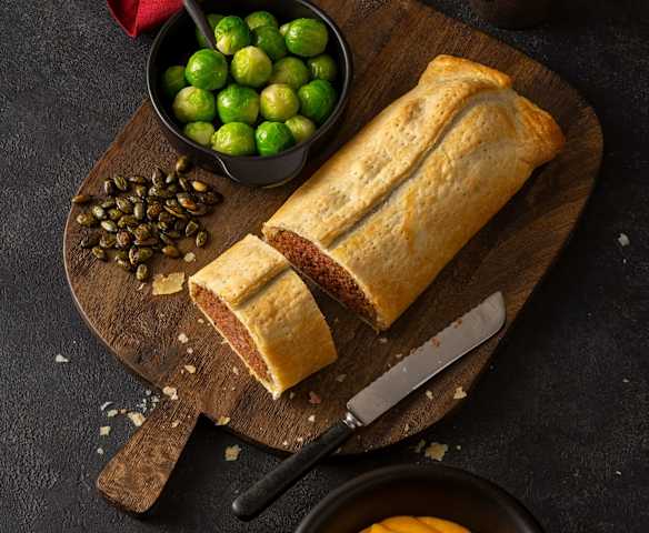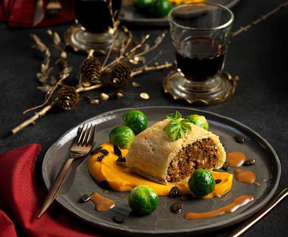 Weihnachtlicher Festtagsbraten mit Kürbispüree und Kohlsprossen (vegan)