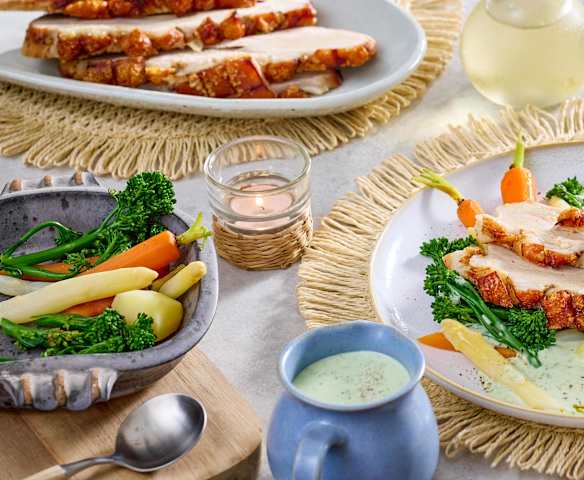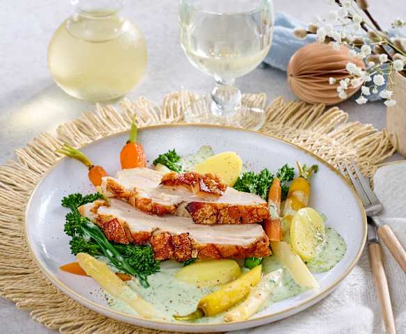 Schinken-Braten mit Bärlauchrahm, Kartoffeln und Frühlingsgemüse