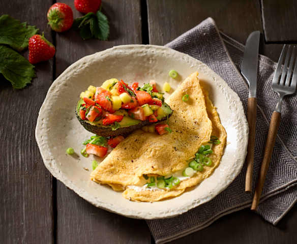 Avocado mit Mango-Erdbeer-Füllung und Omelette