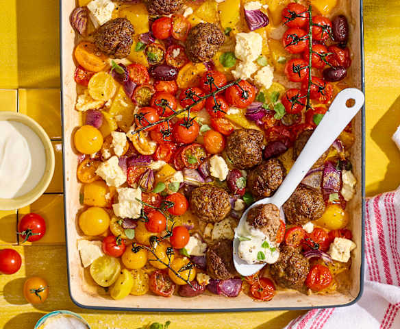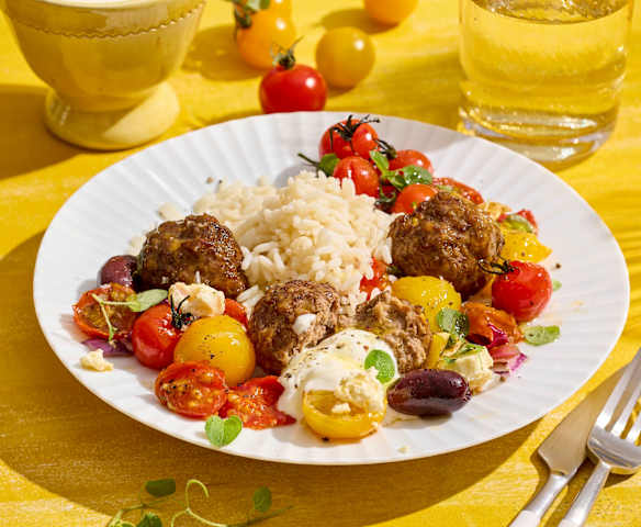 Gyros-Hackbällchen mit bunten Cherry-Tomaten und Reis