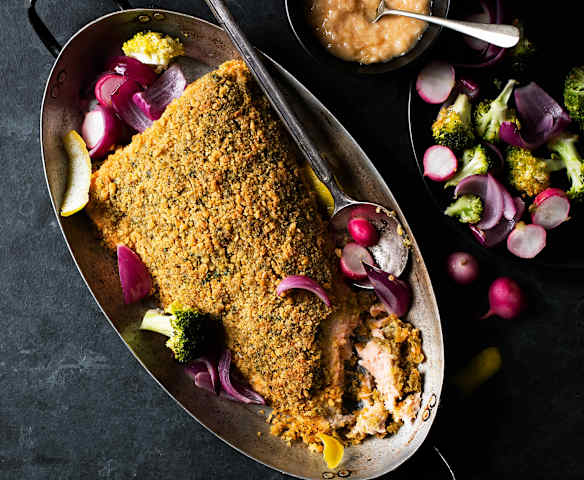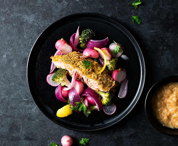 Knuspriger Parmesanlachs mit Gemüse und Zitronensauce