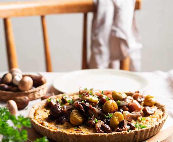 Tarta de castañas, champiñones y arándanos