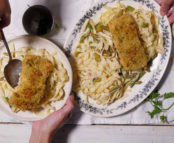 Lachs mit Mandelkruste und Spargel-Tagliatelle