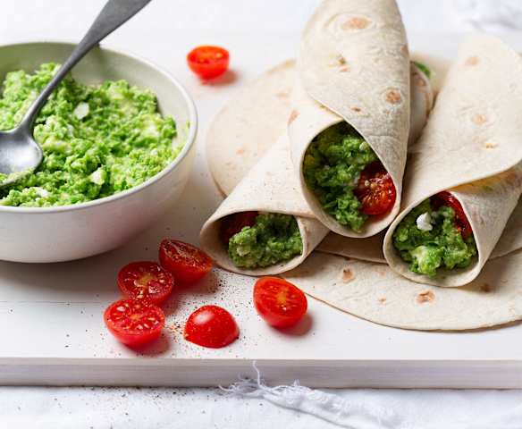 Wraps mit Erbsen-Feta-Dip und Kirschtomaten