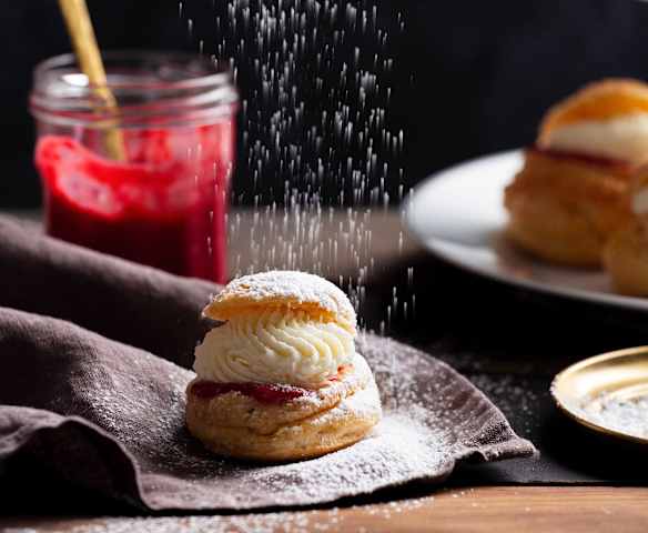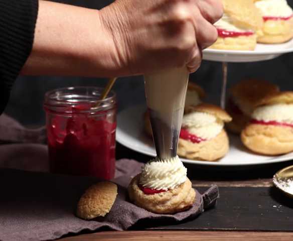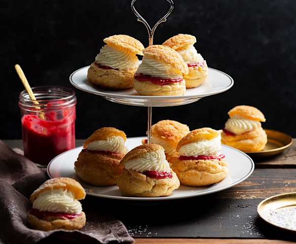 菠蘿泡芙、覆盆子餡和白巧克力鮮奶油
