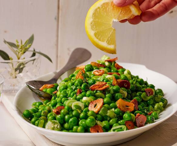 Erbsen und Frühlingszwiebeln in Olivenöl