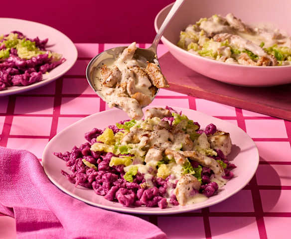 Rote-Bete-Spätzle mit Wirsing-Geschnetzeltem