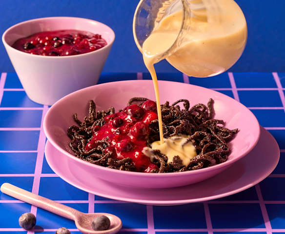 Schokoladenspätzle in Vanillesauce und Beerenkompott