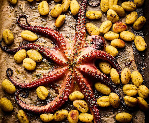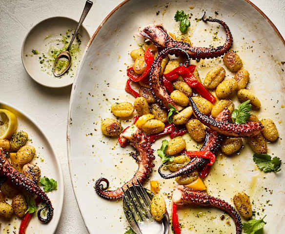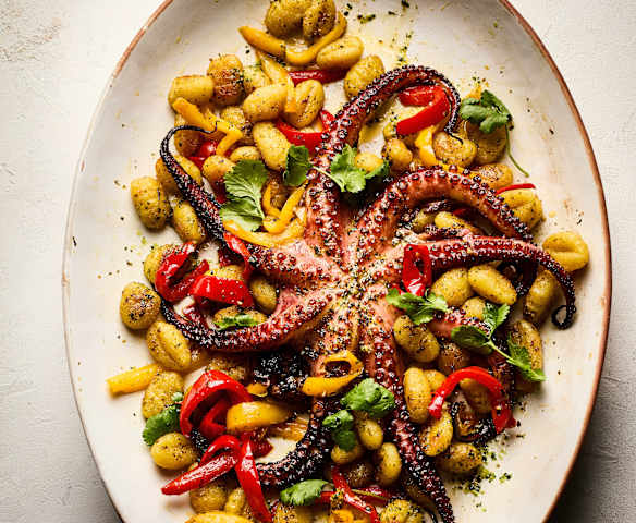 Pulpo asado con ñoquis, pimientos y pesto de cilantro