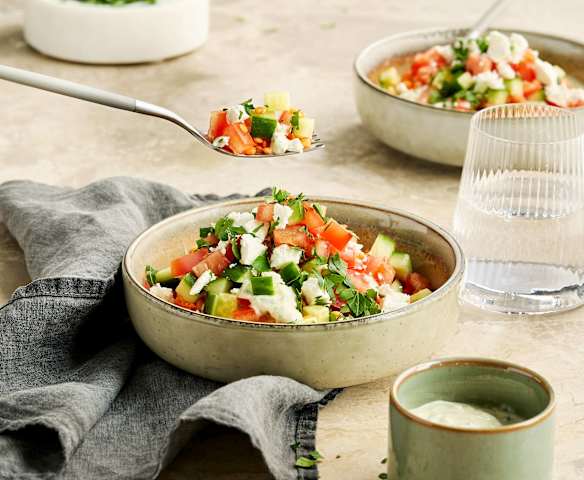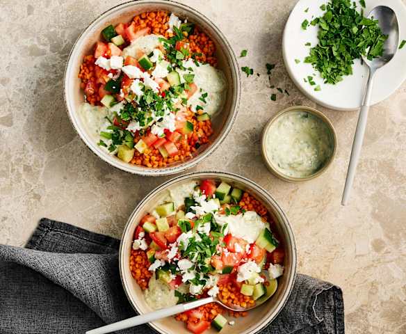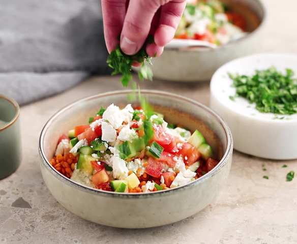 Falafel-Hummus-Bowl mit Aprikosen-Chili-Sauce