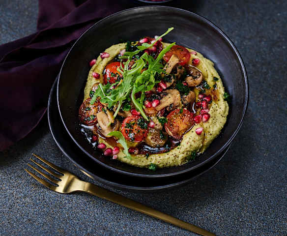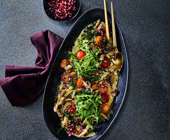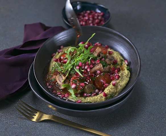 Champignon-Hummus-Salat mit Karamell-Dressing und Granatapfelkernen