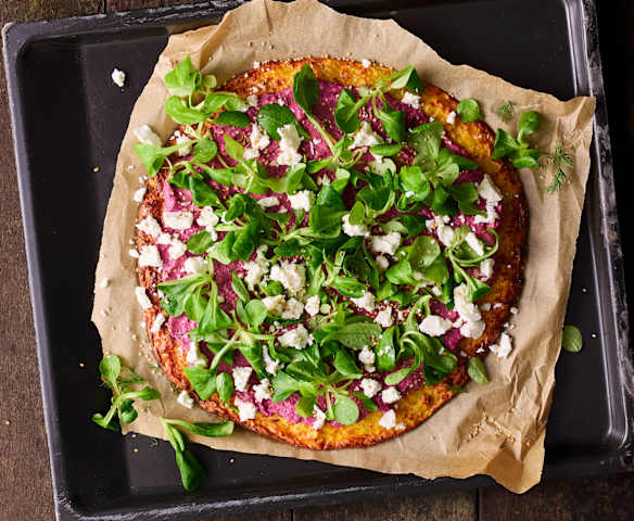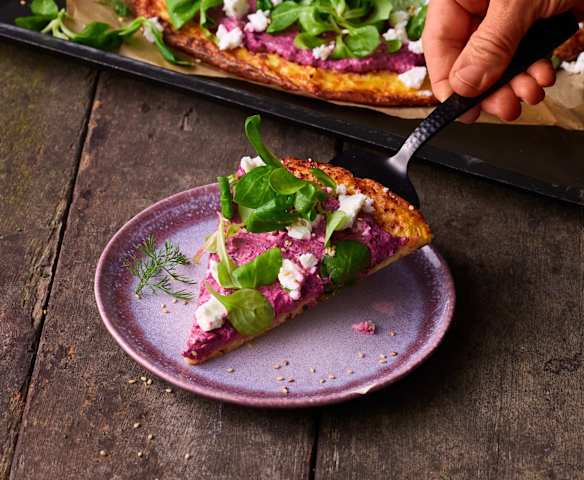 Reibekuchen-Pizza mit Rote-Bete-Creme und Feldsalat