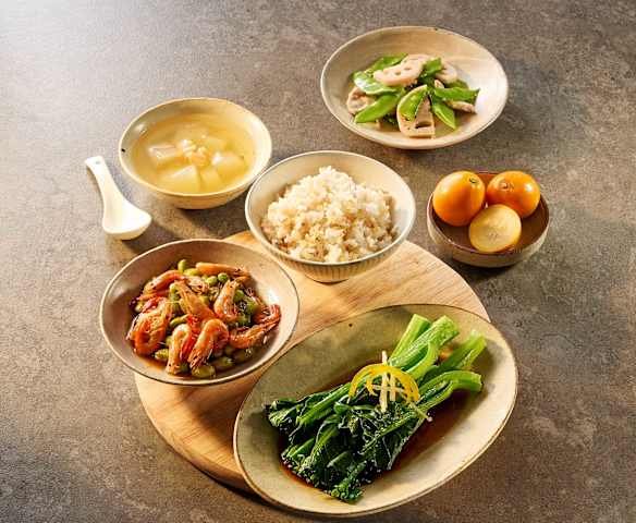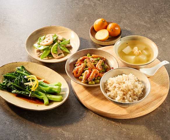 晚餐(糙米饭、毛豆青椒河虾、姜汁芥兰、干贝冬瓜汤、藕片荷兰豆炒肉片)