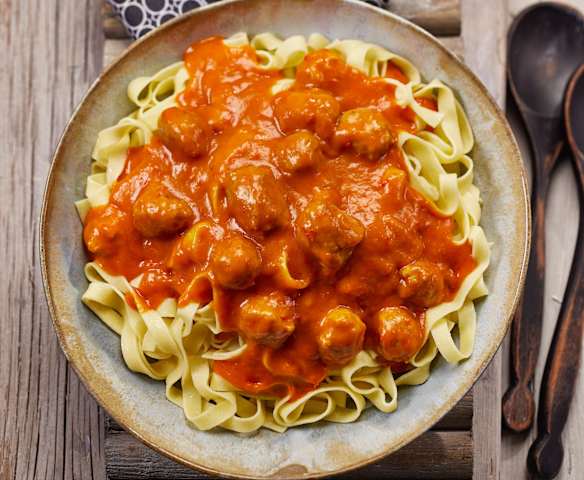 Paprikasauce mit Bratwurstbällchen zu Nudeln
