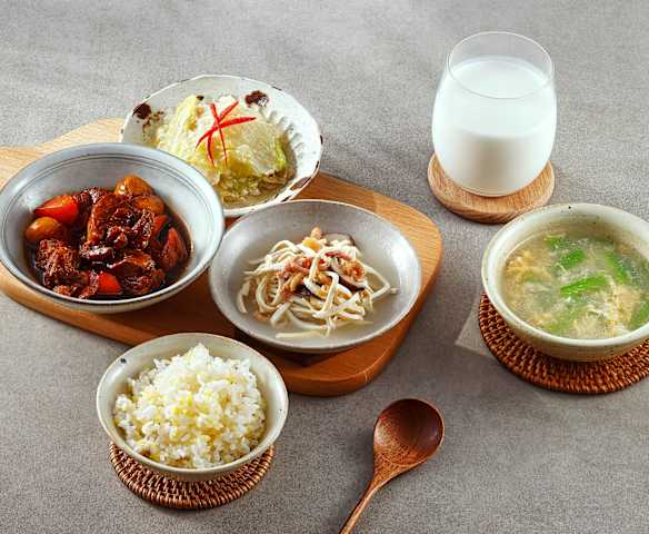 午餐(紫苏栗子焖鸭、火腿干丝、腐乳球生菜、小米饭和丝瓜蛋汤)