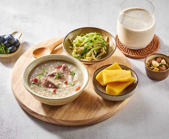 早餐(枸杞百合猪肝粥、蒸红薯、黄瓜豆腐丝和核桃红枣牛奶)