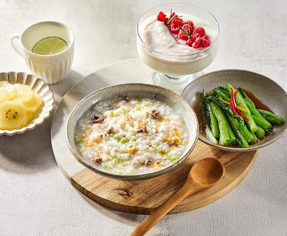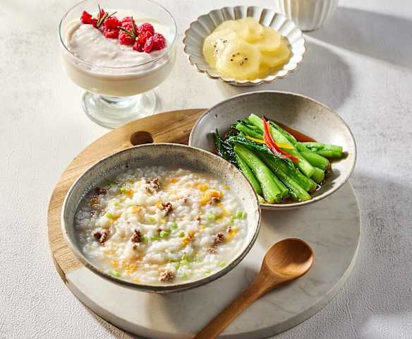 早餐(生滚牛肉粥、树莓芋泥蛋奶布丁和广东菜心)