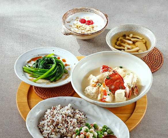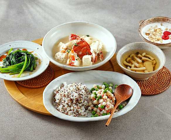 午餐(梭子蟹豆腐煲、火腿鸡头米拌豌豆、糖醋蓬蒿菜、松茸菌菇汤和藜麦饭)