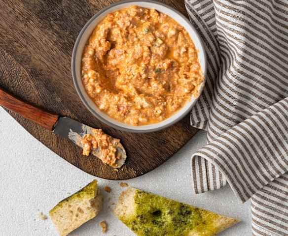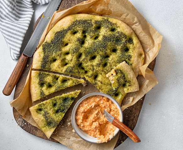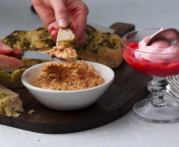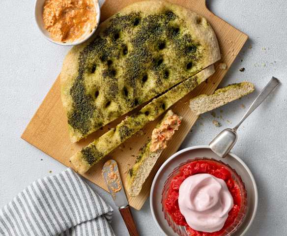 Menü: Vollwert-Focaccia mit Tomaten-Feta-Dip, Erdbeertraum