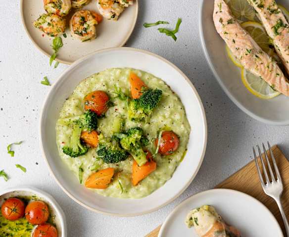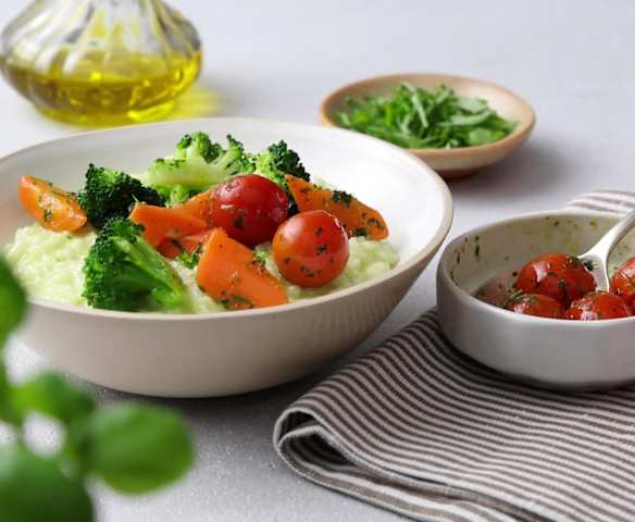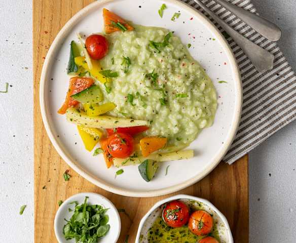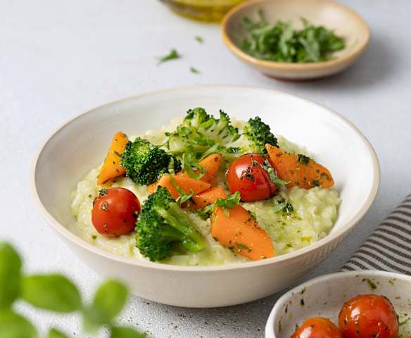 Basilikumrisotto mit Schmortomaten und Gemüse