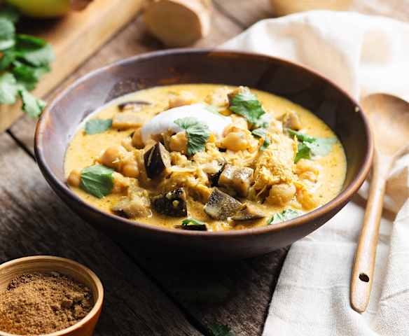 Würziger Melanzani-Kichererbseneintopf mit Huhn