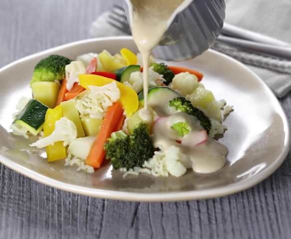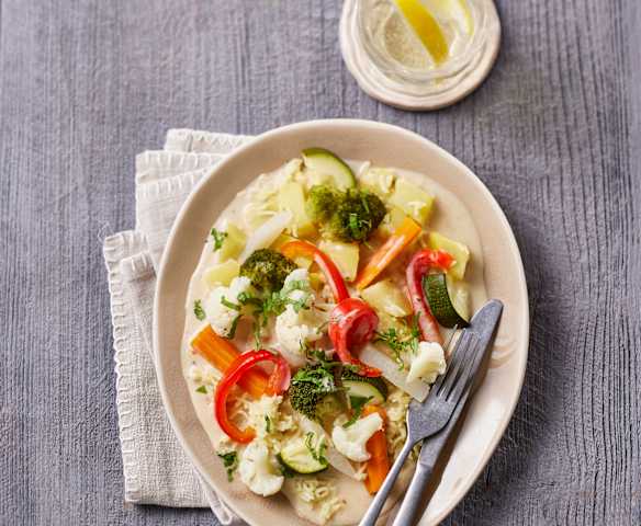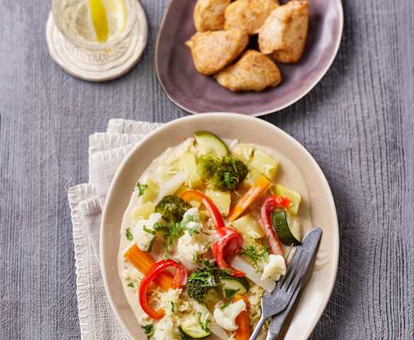 gemischtes Gemüse in Stücken (z. B. Möhren 1 cm, Zucchini 2-3 cm, Paprika 2-3 cm, Brokkoliröschen 2 cm, Kohlrabi 1-2 cm oder Blumenkohl 2 cm)500 g