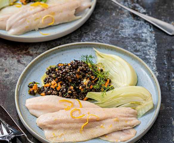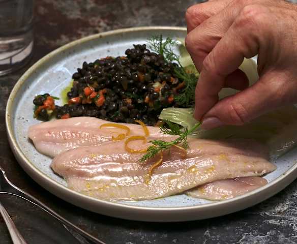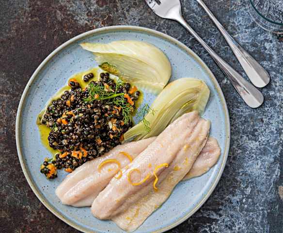 Forellenfilet auf Belugalinsen mit Fenchel und Gemüsevinaigrette