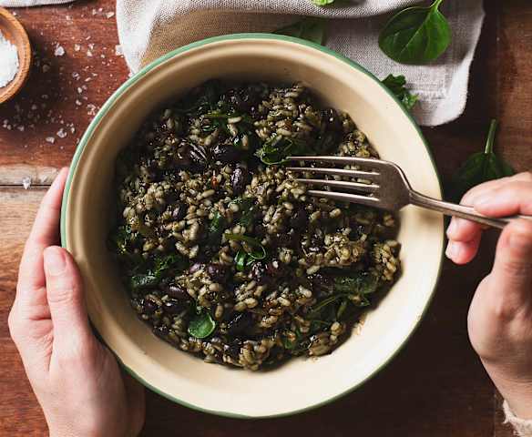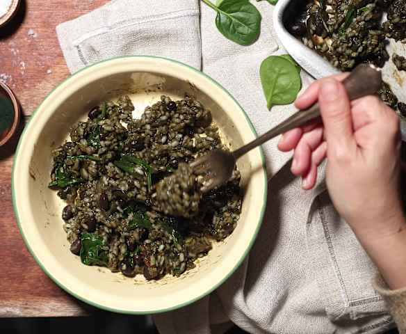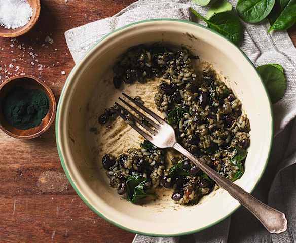 Spirulinová rýže s černými fazolemi a špenátem