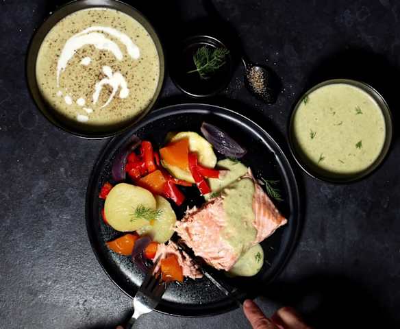 西兰花奶酪汤配三文鱼蔬菜,莳萝酱