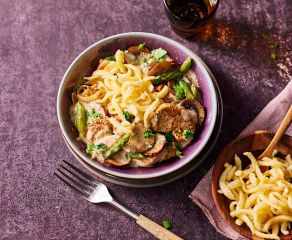 Geschnetzeltes Jäger Art mit Spätzle und grünem Spargel