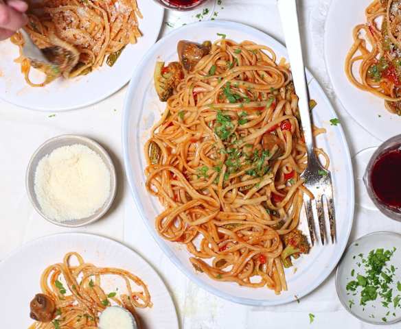 Risottata Mafaldine mit cremiger Pilz-Tomatensauce
