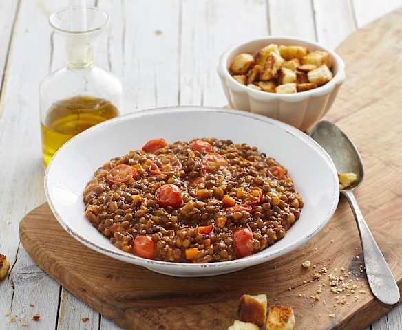 Süsskartoffel-Tomatensuppe mit Curry-Croûtons