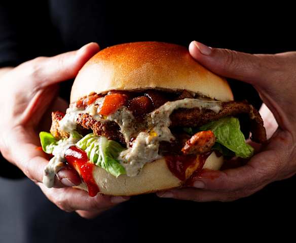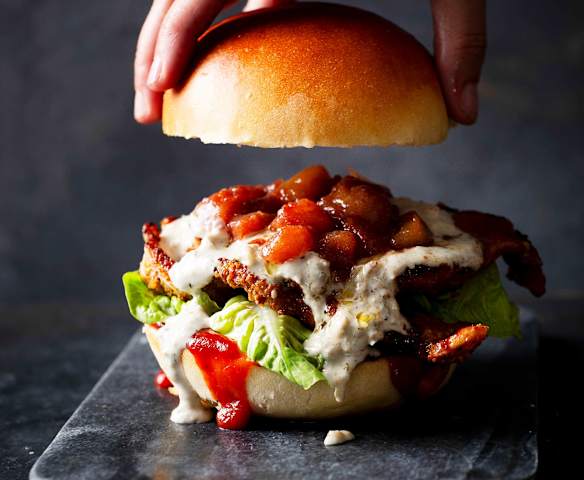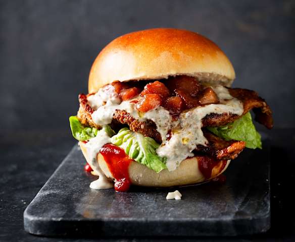 Kotelett-Burger mit Gorgonzola und Marsala-Birnen